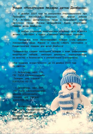 По сообщению электронной газеты префектуры, до 16 декабря в Зеленограде пройдет сбор новогодних сладких подарков для детей Донбасса. Акция «Новогодние подарки детям Донбасса» проводится по инициативе уполномоченного при президенте РФ по правам ребенка Павла Астахова департаментом труда и социальной защиты населения Москвы.